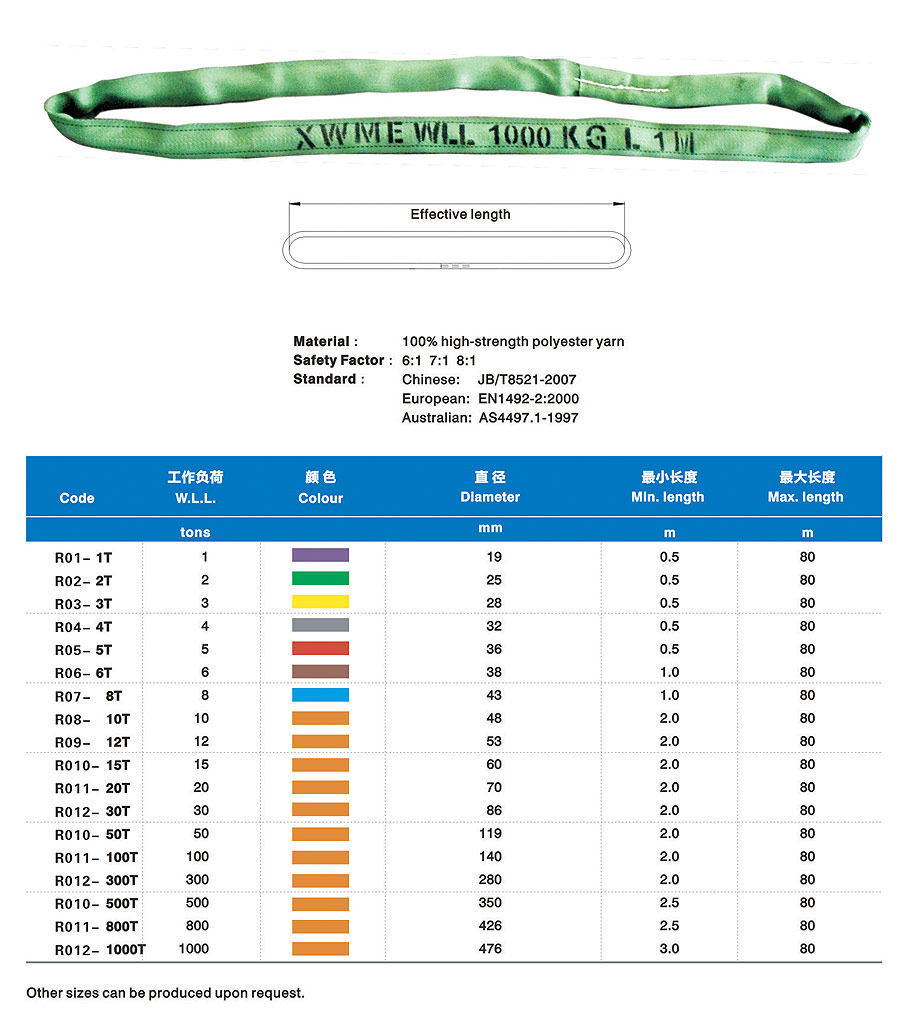 Synthetic fabric lifting belt (hereinafter refers to lifting belt) is a kind of soft lifting belt made of non-metallic materials and successor production of wire rope and chain in the lifting industry which is lighter and more convenient than similar metal and can solve the difficult problems such as large tonnage but small lifting space in the lifting process. The lifting belt is light, convenient and durable. Additionally, it has a noticeable earthquake effect, non-conductive performance, anti-corrosion and protects hanging items from being scratched. Many fracture experiments proved that lifting belt almost inflict zero reverse damage to metallic rope chain. The lifting belt adopts international standard colors to distinguish carrying tonnage. In the application process, carry tonnage can be distinguished by lifting belt jacket color if label on lifting belt wears Synthetic fabric lifting belt was used worldwide in the early days and has an application history spanning over fifty years. After being popularized in China for more than twenty years, it has gradually replaced wire rope rigging and chain rigging in many industries.