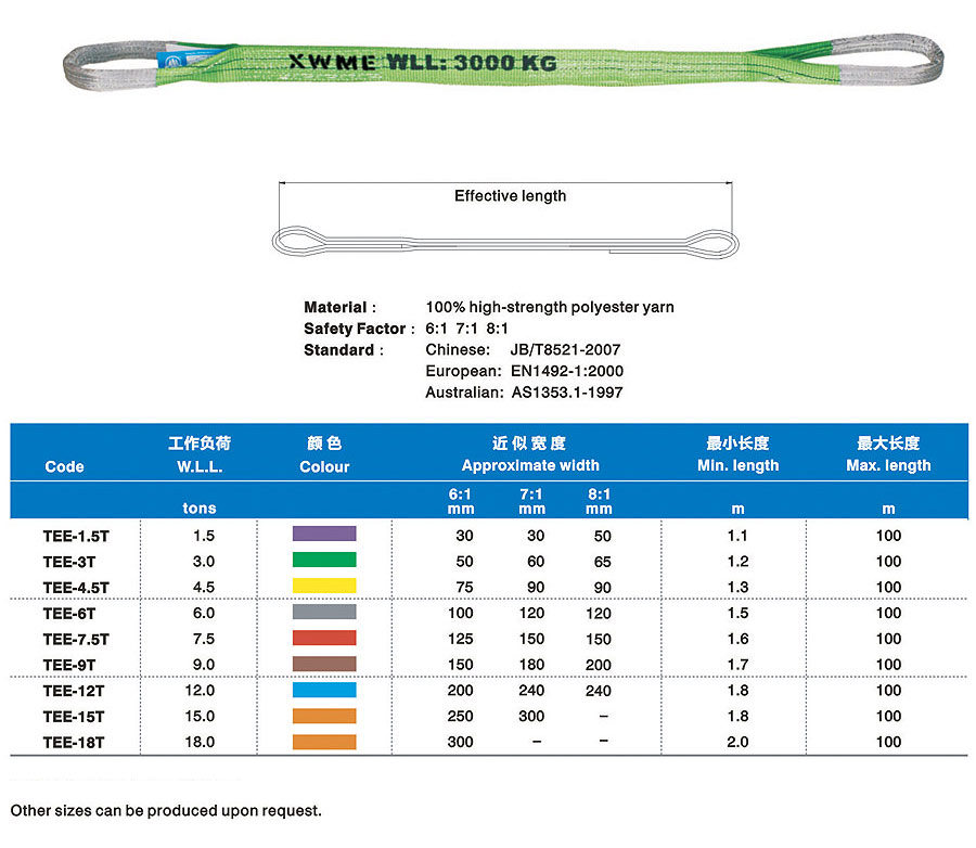 Synthetic fabric lifting belt (hereinafter refers to lifting belt) is a kind of soft lifting belt made of non-metallic materials and successor production of wire rope and chain in the lifting industry which is lighter and more convenient than similar metal and can solve the difficult problems such as large tonnage but small lifting space in the lifting process. The lifting belt is light, convenient and durable. Additionally, it has a noticeable earthquake effect, non-conductive performance, anti-corrosion and protects hanging items from being scratched. Many fracture experiments proved that lifting belt almost inflict zero reverse damage to metallic rope chain. The lifting belt adopts international standard colors to distinguish carrying tonnage. In the application process, carry tonnage can be distinguished by lifting belt jacket color if label on lifting belt wears Synthetic fabric lifting belt was used worldwide in the early days and has an application history spanning over fifty years. After being popularized in China for more than twenty years, it has gradually replaced wire rope rigging and chain rigging in many industries.