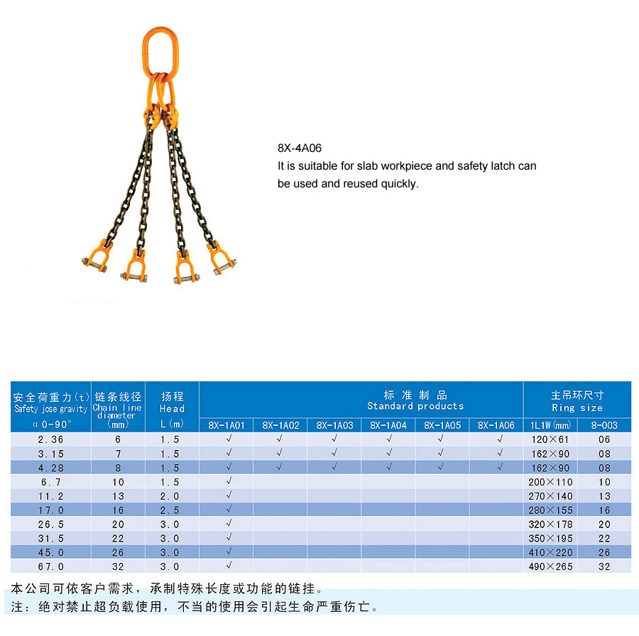 Chain rigging is a kind of rigging formed by connecting metallic chain links, which is divided into two categories in form, namely welding type and assembling type and falls into single foot and multi-feet in structure. The chain rigging is made of high quality alloy steel, boasts wear resistance, high strength, durability and flexibility and is suitable for large scale and frequent usage. Additionally, it is anti-radiation and high temperature(-40~200℃) and is suitable for lifting hot steel billet and steel coil. The flexible multiple feet and various combinations can improve efficiency and cut cost. The company offers general types of ship store, accessories and marine spare supply and technical services and it aims to provide best products and services for our customers.