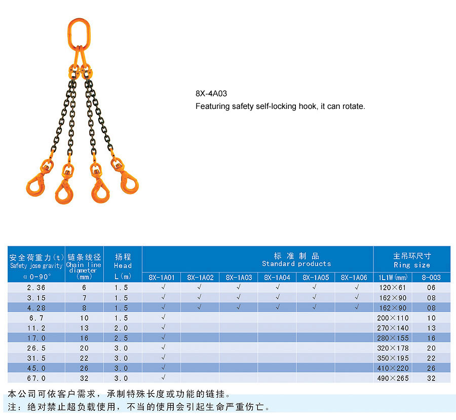 Chain rigging is a kind of rigging formed by connecting metallic chain links, which is divided into two categories in form, namely welding type and assembling type and falls into single foot and multi-feet in structure. The chain rigging is made of high quality alloy steel, boasts wear resistance, high strength, durability and flexibility and is suitable for large scale and frequent usage. Additionally, it is anti-radiation and high temperature(-40~200℃) and is suitable for lifting hot steel billet and steel coil. The flexible multiple feet and various combinations can improve efficiency and cut cost. The company offers general types of ship store, accessories and marine spare supply and technical services and it aims to provide best products and services for our customers.