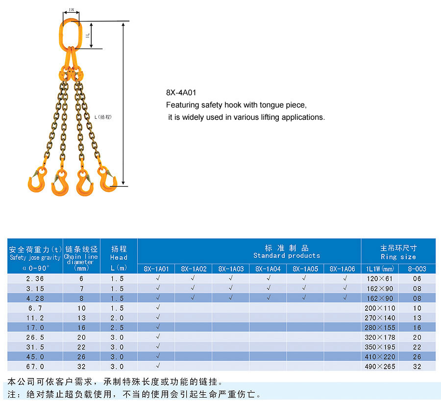 Chain rigging is a kind of rigging formed by connecting metallic chain links, which is divided into two categories in form, namely welding type and assembling type and falls into single foot and multi-feet in structure. The chain rigging is made of high quality alloy steel, boasts wear resistance, high strength, durability and flexibility and is suitable for large scale and frequent usage. Additionally, it is anti-radiation and high temperature(-40~200℃) and is suitable for lifting hot steel billet and steel coil. The flexible multiple feet and various combinations can improve efficiency and cut cost. The company offers general types of ship store, accessories and marine spare supply and technical services and it aims to provide best products and services for our customers.
