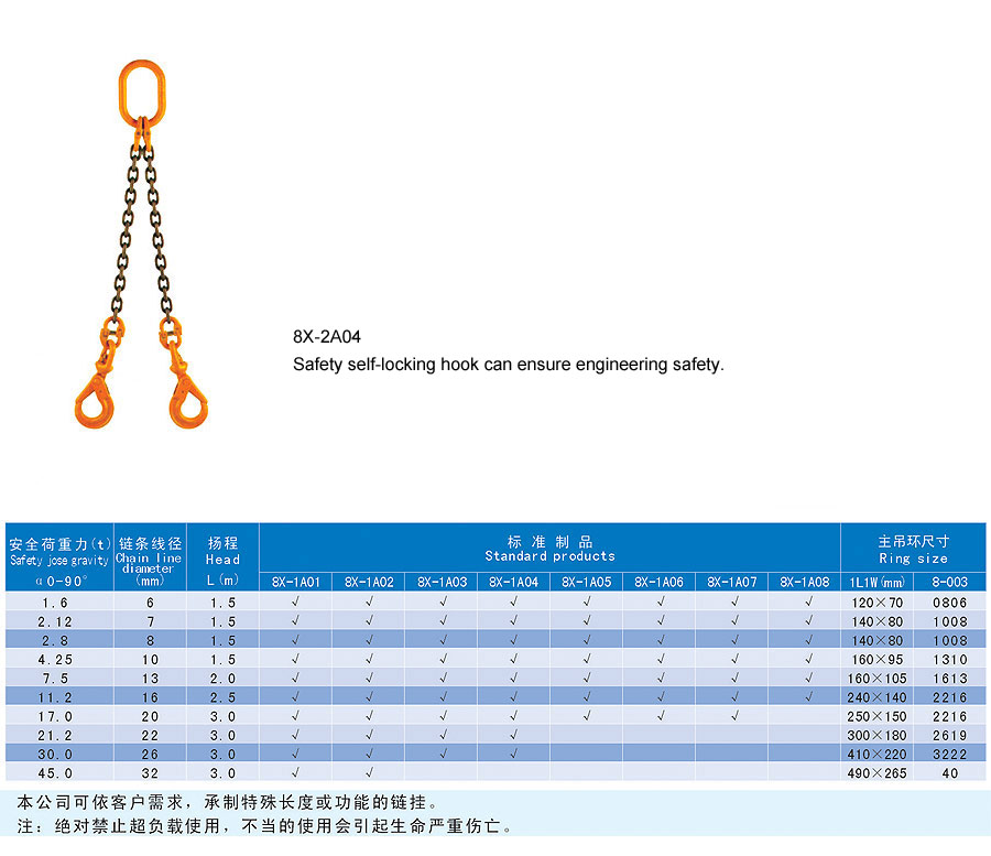 Chain rigging is a kind of rigging formed by connecting metallic chain links, which is divided into two categories in form, namely welding type and assembling type and falls into single foot and multi-feet in structure. The chain rigging is made of high quality alloy steel, boasts wear resistance, high strength, durability and flexibility and is suitable for large scale and frequent usage. Additionally, it is anti-radiation and high temperature(-40~200℃) and is suitable for lifting hot steel billet and steel coil. The flexible multiple feet and various combinations can improve efficiency and cut cost. The company offers general types of ship store, accessories and marine spare supply and technical services and it aims to provide best products and services for our customers.