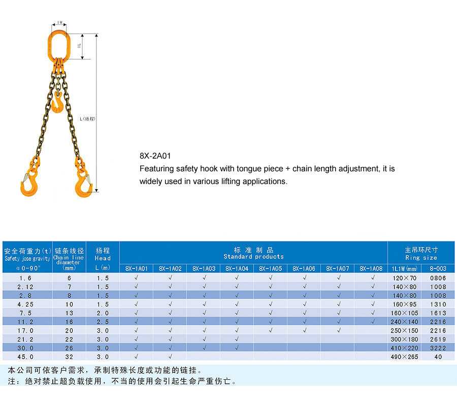 Chain rigging is a kind of rigging formed by connecting metallic chain links, which is divided into two categories in form, namely welding type and assembling type and falls into single foot and multi-feet in structure. The chain rigging is made of high quality alloy steel, boasts wear resistance, high strength, durability and flexibility and is suitable for large scale and frequent usage. Additionally, it is anti-radiation and high temperature(-40~200℃) and is suitable for lifting hot steel billet and steel coil. The flexible multiple feet and various combinations can improve efficiency and cut cost. The company offers general types of ship store, accessories and marine spare supply and technical services and it aims to provide best products and services for our customers.