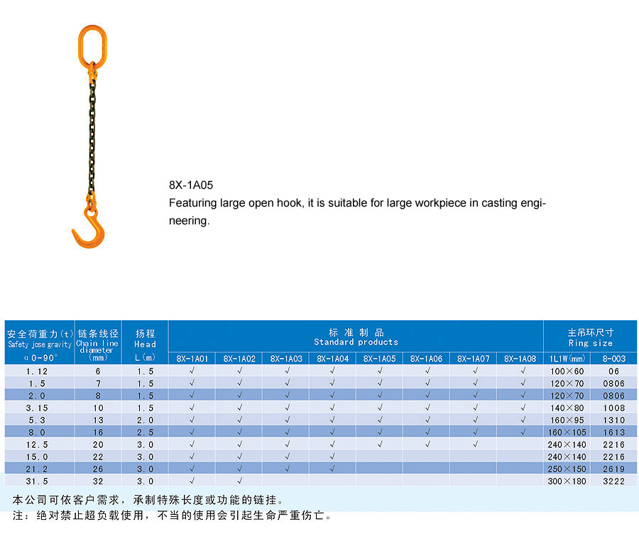 Chain rigging is a kind of rigging formed by connecting metallic chain links, which is divided into two categories in form, namely welding type and assembling type and falls into single foot and multi-feet in structure. The chain rigging is made of high quality alloy steel, boasts wear resistance, high strength, durability and flexibility and is suitable for large scale and frequent usage. Additionally, it is anti-radiation and high temperature(-40~200℃) and is suitable for lifting hot steel billet and steel coil. The flexible multiple feet and various combinations can improve efficiency and cut cost. The company offers general types of ship store, accessories and marine spare supply and technical services and it aims to provide best products and services for our customers.