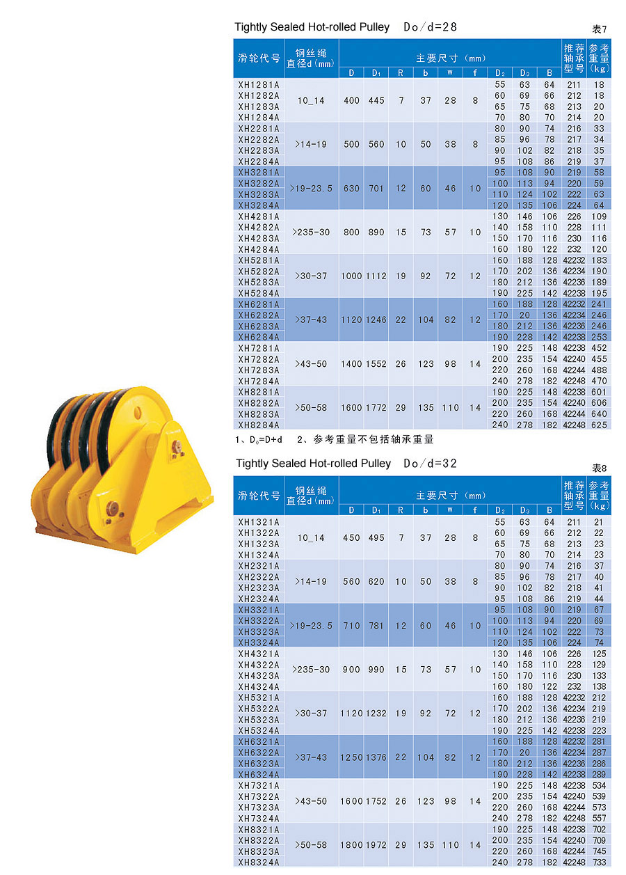Tackle is divided into single-wheel tackle, double-wheel tackle and multiple –wheel tackle according to wheel number; it is also classified into hook tackle, chain ring tackle, ring tackle and hanging beam tackle according to the connection way between tackle and hanging objects. General speaking, most of small or medium sized tackles fall into hook tackle, chain ring tackle and ring tackle while large sized tackles are usually ring tackle or hanging beam tackle; it is categorized into tackle with sliding bearing mounted between axles and tackle with rolling bearing mounted between axles according to the joint of wheel and axle; it can be divided into opened tackle and closed tackle according to splint. The splint of opened tackle can be opened to facilitate installing cable and most of opened tackles are single wheel tackle which is used as guide tackle at the bottom of standing derrick; it can be divided into fixed tackle and movable tackle according usage way. It is convenient to use tackles which can be widely used in places such as factory, mine, agriculture, electricity power, construction, wharf, dock, machine installation in warehouse and cargo lifting in a manual and mechanical way.