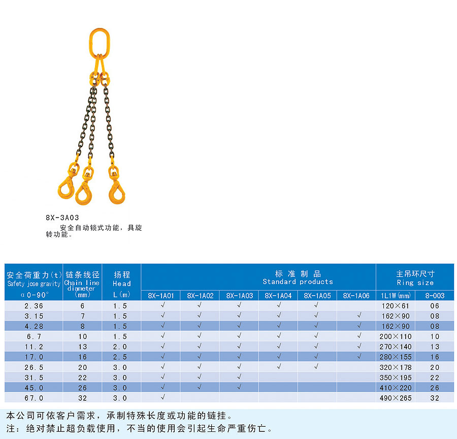 鏈條索具是以金屬鏈環(huán)連接而成的索具,按其形式分主要有焊接和組裝兩種,按其構造分有單肢和多肢等,采用的是優(yōu)質合金鋼,耐磨性好、強度高、使用壽命長、易彎曲。適合大規(guī)模、頻繁使用的場合;其還具有耐輻射高溫(-40~222℃)的特點,亦適用于熱鋼胚、卷鋼的吊運。靈活的多肢、多種組合形式,可提高工作效率,降低成本。