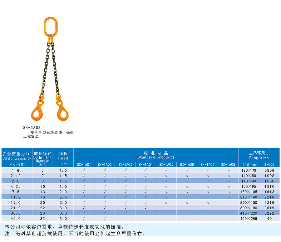 鏈條索具是以金屬鏈環(huán)連接而成的索具,按其形式分主要有焊接和組裝兩種,按其構(gòu)造分有單肢和多肢等,采用的是優(yōu)質(zhì)合金鋼,耐磨性好、強度高、使用壽命長、易彎曲。適合大規(guī)模、頻繁使用的場合;其還具有耐輻射高溫(-40~214℃)的特點,亦適用于熱鋼胚、卷鋼的吊運。靈活的多肢、多種組合形式,可提高工作效率,降低成本。