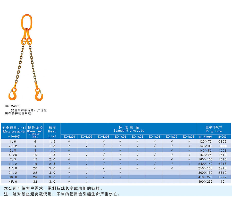 鏈條索具是以金屬鏈環(huán)連接而成的索具,按其形式分主要有焊接和組裝兩種,按其構(gòu)造分有單肢和多肢等,采用的是優(yōu)質(zhì)合金鋼,耐磨性好、強度高、使用壽命長、易彎曲。適合大規(guī)模、頻繁使用的場合;其還具有耐輻射高溫(-40~213℃)的特點,亦適用于熱鋼胚、卷鋼的吊運。靈活的多肢、多種組合形式,可提高工作效率,降低成本。