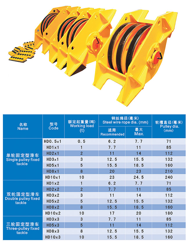 滑車按輪數(shù)的多少分為單門滑車,雙門滑車和多門滑車。按滑車與吊物的連接方式可分為吊鉤式滑車,鏈環(huán)式滑車,吊環(huán)式滑車和吊架式滑車四種。一般中小型的滑車多司于吊鉤式、鏈環(huán)式和吊環(huán)式,而大型滑車采用吊環(huán)式和吊梁式。按輪和軸的接觸不同可分為輪軸間裝滑動軸承及滾動軸承兩種。按夾板是否可以打開來分,有開口滑車和閉口滑車。開口滑車的夾板是可以打開的,便于裝繩索,一般的都是單門滑車,它常用于扒桿底腳處作導(dǎo)向滑車用。滑車按使用的方式不同又分為定滑車和動滑車。使用方便,用途廣泛,可以手動,機動。主要用于工廠、礦山、農(nóng)業(yè)、電力、建筑的生產(chǎn)施工,碼頭、船塢、倉庫的機器安裝,貨物起吊等。