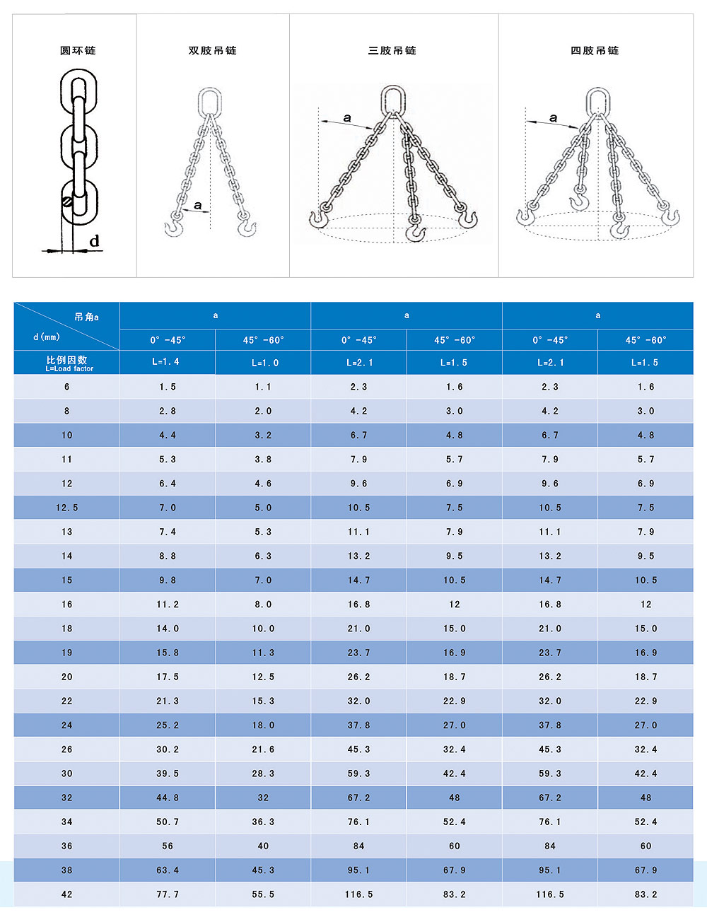 鏈條索具是以金屬鏈環連接而成的索具,按其形式分主要有焊接和組裝兩種,按其構造分有單肢和多肢等,采用的是優質合金鋼,耐磨性好、強度高、使用壽命長、易彎曲。適合大規模、頻繁使用的場合;其還具有耐輻射高溫(-40~201℃)的特點,亦適用于熱鋼胚、卷鋼的吊運。靈活的多肢、多種組合形式,可提高工作效率,降低成本。