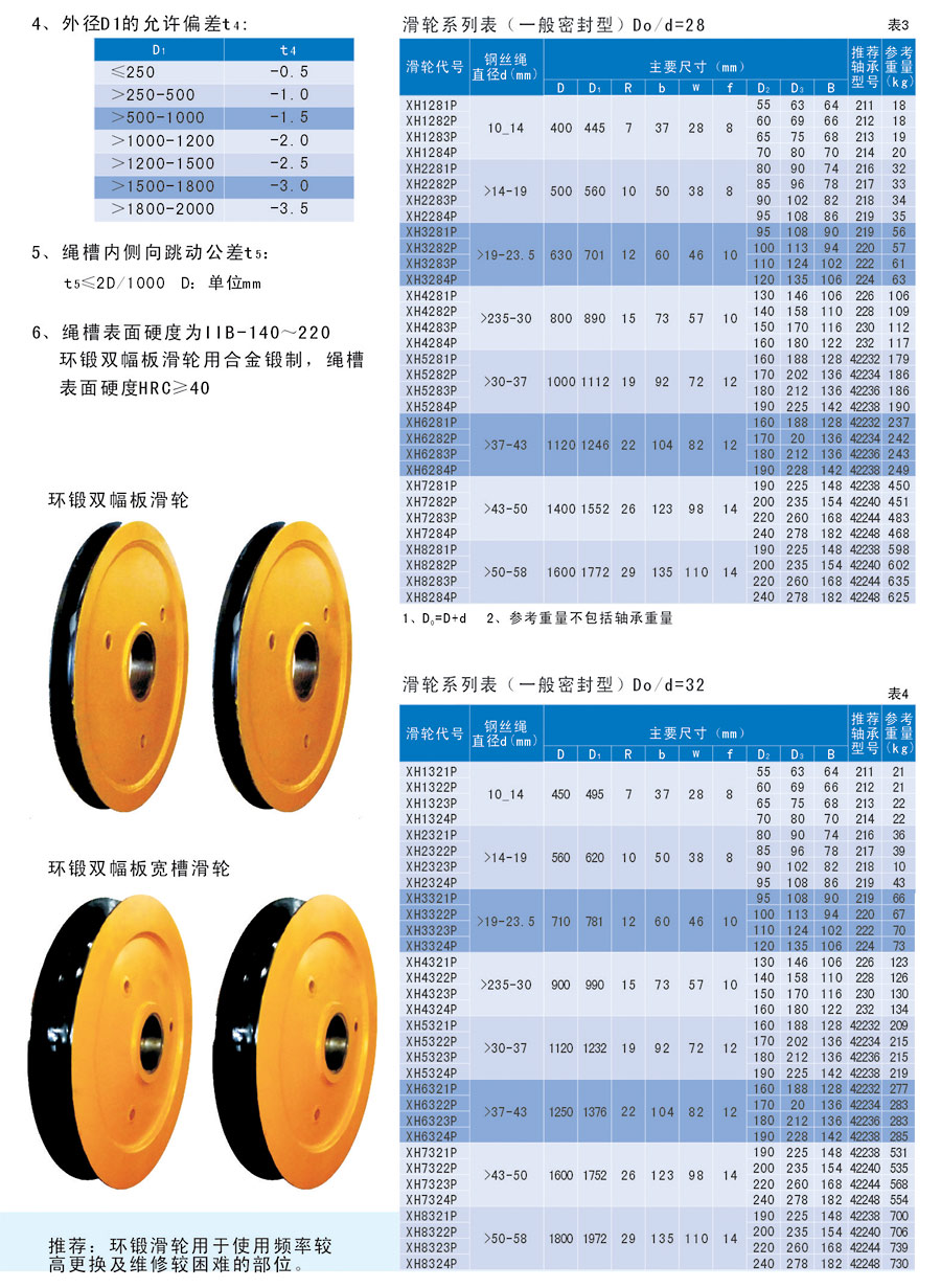 滑車按輪數的多少分為單門滑車,雙門滑車和多門滑車。按滑車與吊物的連接方式可分為吊鉤式滑車,鏈環式滑車,吊環式滑車和吊架式滑車四種。一般中小型的滑車多司于吊鉤式、鏈環式和吊環式,而大型滑車采用吊環式和吊梁式。按輪和軸的接觸不同可分為輪軸間裝滑動軸承及滾動軸承兩種。按夾板是否可以打開來分,有開口滑車和閉口滑車。開口滑車的夾板是可以打開的,便于裝繩索,一般的都是單門滑車,它常用于扒桿底腳處作導向滑車用。滑車按使用的方式不同又分為定滑車和動滑車。使用方便,用途廣泛,可以手動,機動。主要用于工廠、礦山、農業、電力、建筑的生產施工,碼頭、船塢、倉庫的機器安裝,貨物起吊等。