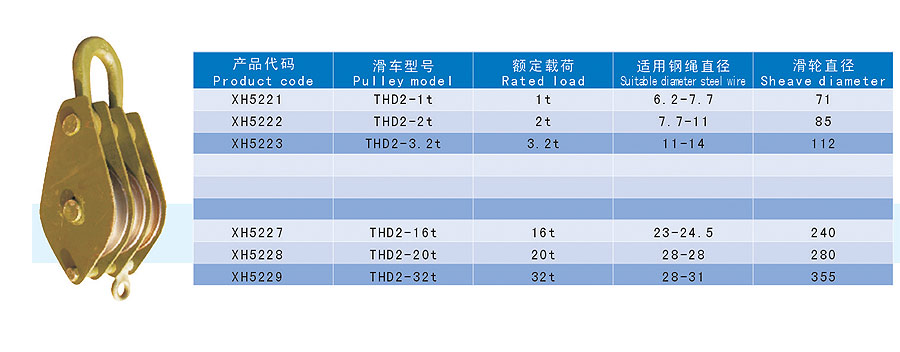 滑車按輪數的多少分為單門滑車,雙門滑車和多門滑車。按滑車與吊物的連接方式可分為吊鉤式滑車,鏈環式滑車,吊環式滑車和吊架式滑車四種。一般中小型的滑車多司于吊鉤式、鏈環式和吊環式,而大型滑車采用吊環式和吊梁式。按輪和軸的接觸不同可分為輪軸間裝滑動軸承及滾動軸承兩種。按夾板是否可以打開來分,有開口滑車和閉口滑車。開口滑車的夾板是可以打開的,便于裝繩索,一般的都是單門滑車,它常用于扒桿底腳處作導向滑車用。滑車按使用的方式不同又分為定滑車和動滑車。使用方便,用途廣泛,可以手動,機動。主要用于工廠、礦山、農業、電力、建筑的生產施工,碼頭、船塢、倉庫的機器安裝,貨物起吊等。